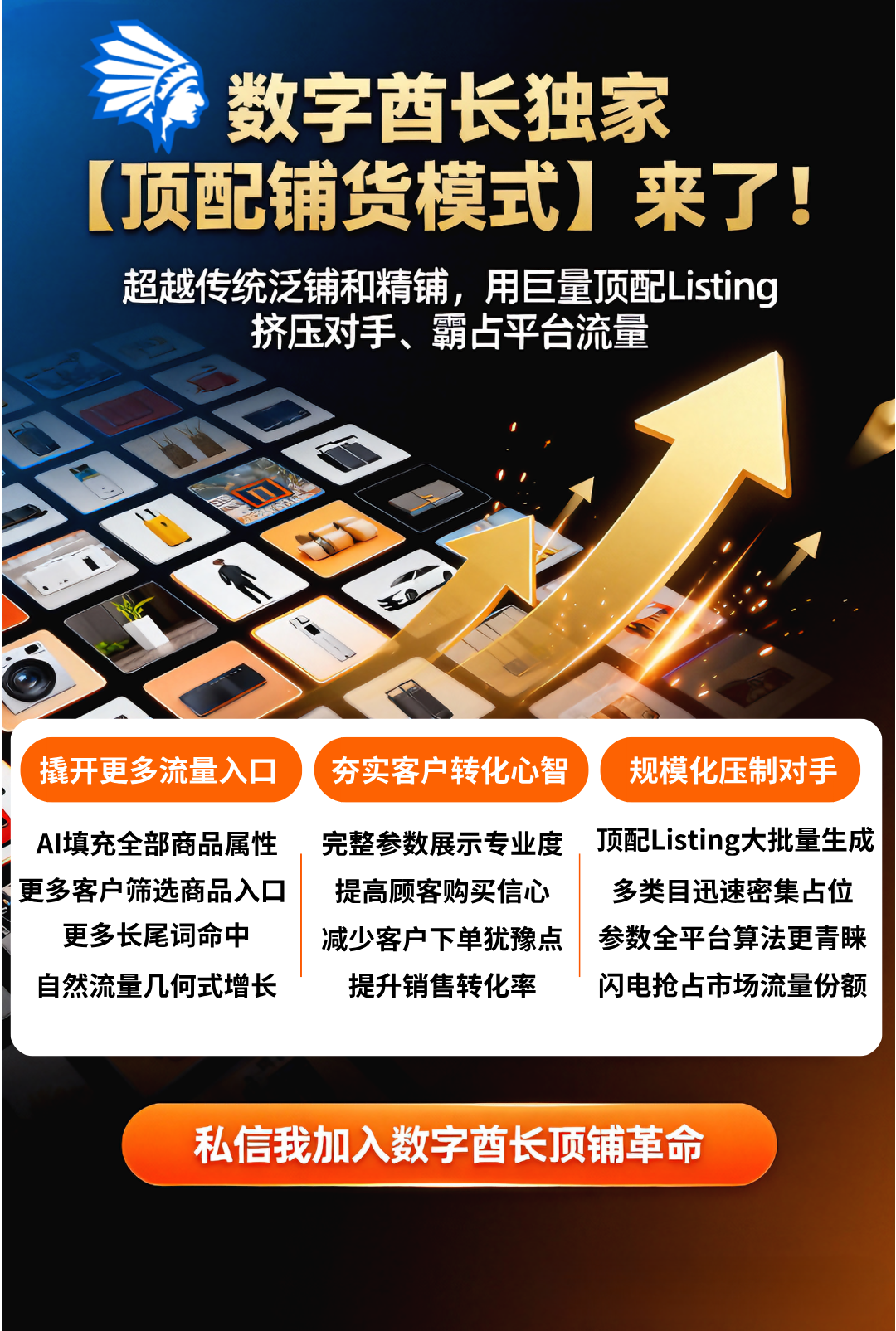数字酋长独家跨境电商【顶铺模式】来了!超越传统铺货和精铺,用巨量顶配listing挤压对手霸占平台流量